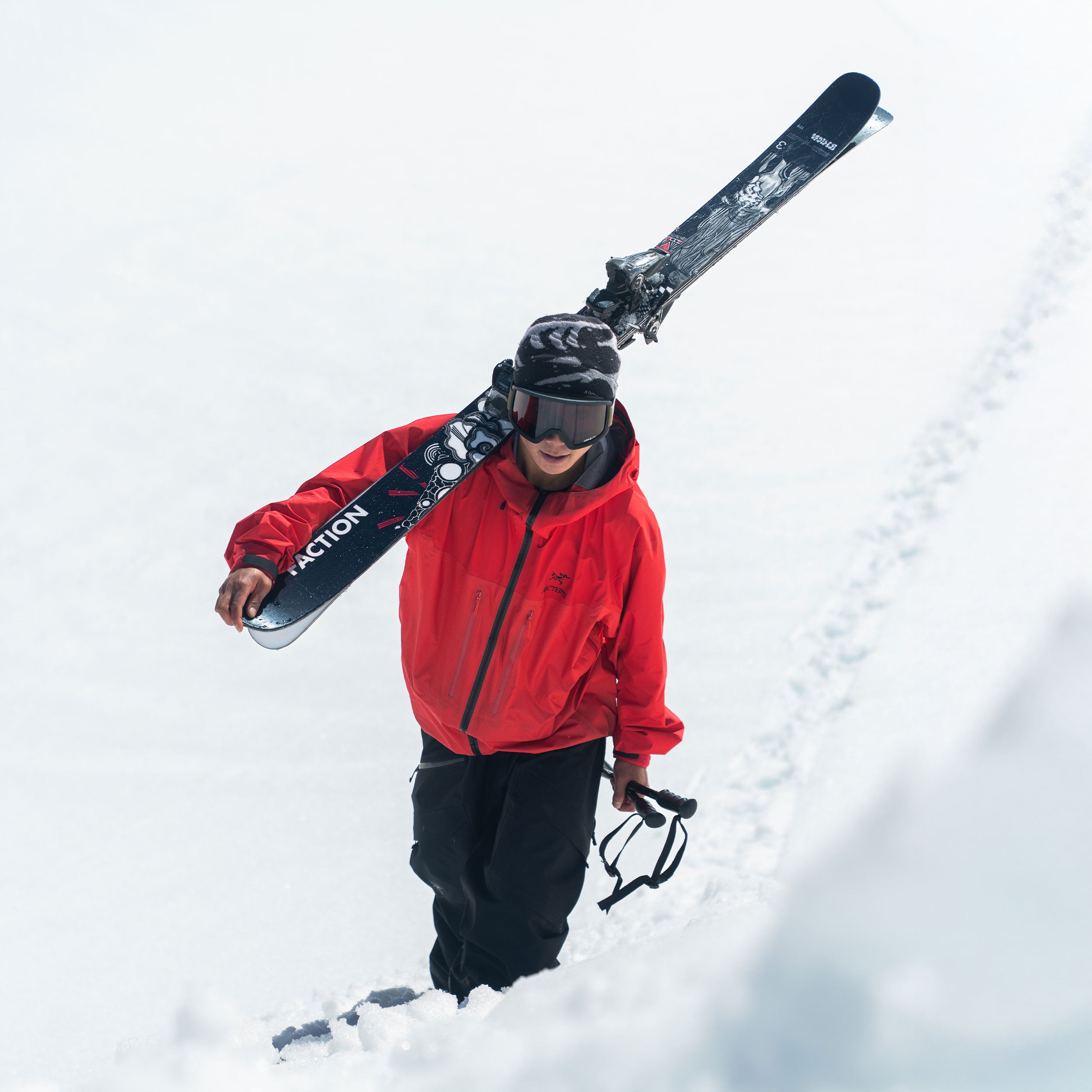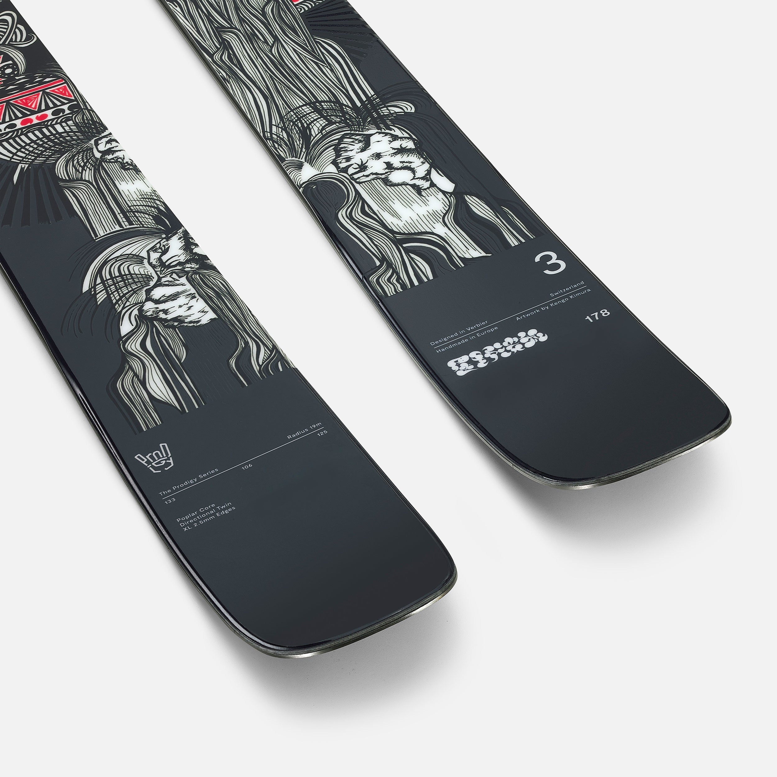 The Prodigy 3 Koga is a fusion of Japanese artistry and straightforward athleticism. Acclaimed artist Kengo Kimura returns to Faction with artwork inspired by the mystical spirits and snow-laden mountains of Niigata. Celebrating one of Japanโs standout freeskiing talents, Koga Hoshino, Kengo was inspired by Koga's movements, akin to a โkite with a cut stringโ. This design embraces the ideas of ma (intervals) and yohaku (empty space) that exist within Koga's riding.