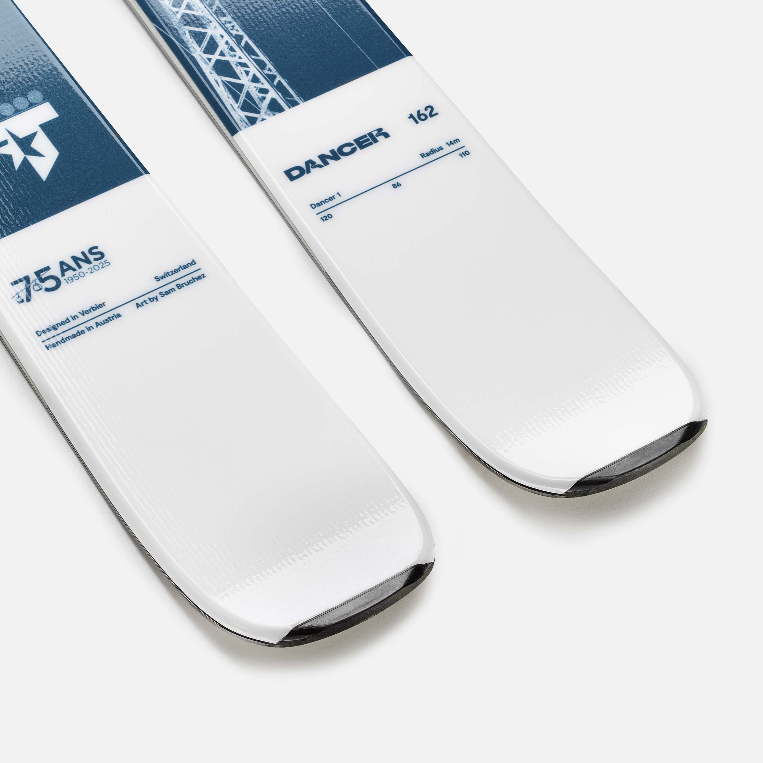 Sur ce ski en édition limitée, l'artiste de Verbier Sam Bruchez a repris les plans originaux de l'emblématique Télécabine de Savoleyres, et leur a donné une nouvelle vie sur ce dessus cyanotype. Bientôt remplacé, ce vestige de la station a commencé à tourner dans les jours hédonistes des années 1970.